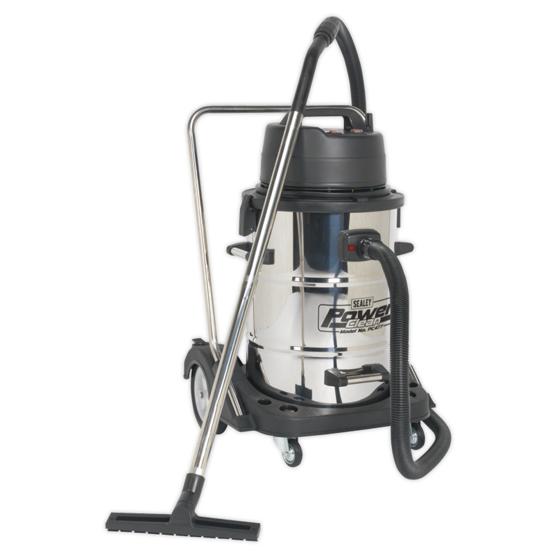 Sealey PC477 Vacuum Cleaner Industrial Wet Dry 77L Stainless Steel Drum with Swivel Emptying 2400W