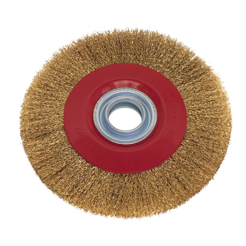 Brass coated steel crimped wire wheel for 200mm bench grinders.Includes reduction bushes to fit 13, 16, 19, 22, 25mm spindles (2 of each size).