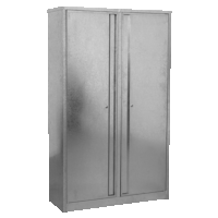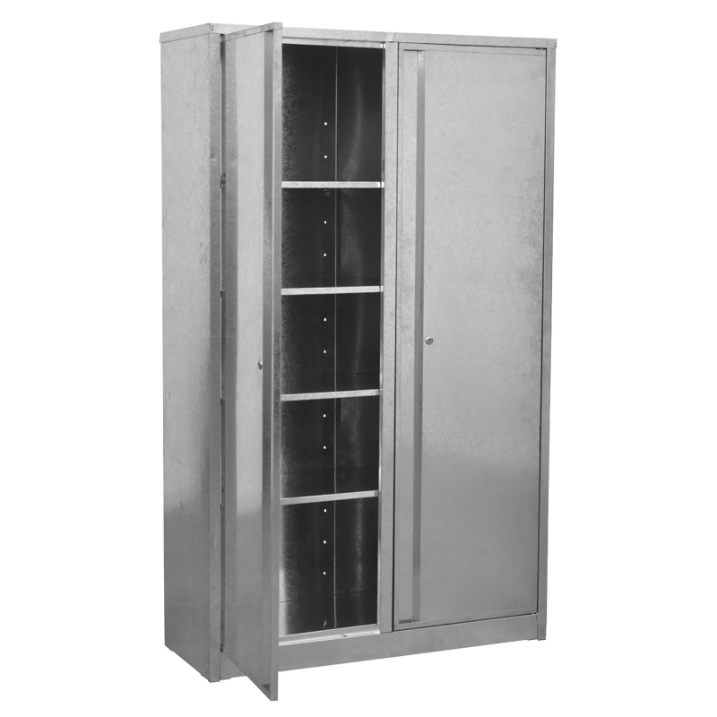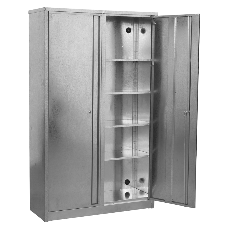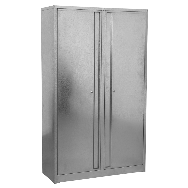 Floor standing galvanized steel cabinet with lockable double doors.Fitted with four adjustable shelves and base storage.