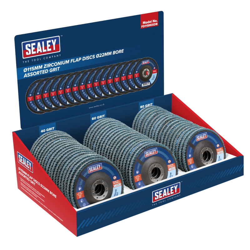 Sealey FD115MIXDB Assorted Grit Flap Discs Zirconium 115mm 22mm Bore (Display Box of 60)